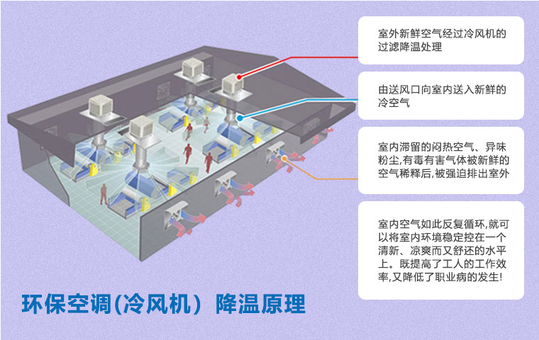 在空氣不流通的環(huán)境中,尤其是化工車間,容易產(chǎn)生建筑綜合癥,如悶熱、頭疼、眩暈、過敏、咳嗽等不適癥狀。使用環(huán)保空調(diào)(冷風(fēng)機)通風(fēng)降溫方案即可以有效降溫,又能保證空氣流通